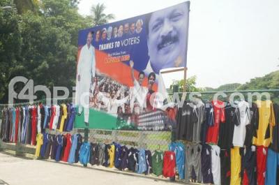 Photo Caption : Clothes hanged for Sale, below the Political Banner installed at Ulsoor Lake, in Bangalore on Tuesday 22nd May 2013