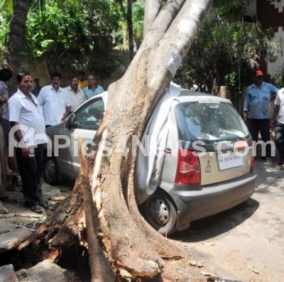 Photo Caption : Tree uprooted after Havoc Rain last midnight, causing damage to a Vehicle at Austin town, in Bangalore on Thursday 23rd May 2013