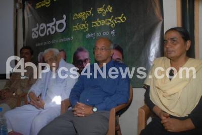 Photo Caption : HS Doreswamy, Freedom Fighter with Ullas Karanta, V Gayatri and Vinay seen during the Discussion Programme on Science, Agriculture and Media, at Suchitra Auditorium, in Bangalore on Sunday 26th May 2013