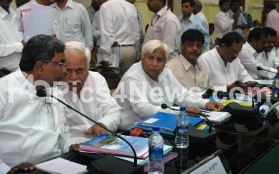 Photo Caption : Siddaramaiah, CM seen with RV Deshpande, HK Patil, H C Mahadevappa K J George, U T Kadaar, ministers at a meeting with Deputy Commissioner and chief executive officers of Zilla Panchayats to review the drinking water supply at Conference Hall, Vidhana Soudha, in Bangalore on Monday 27th May2013