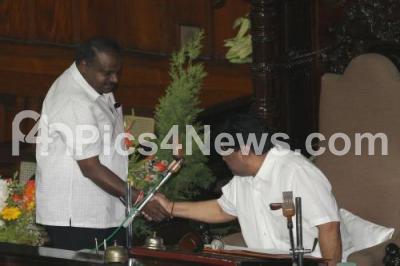 Photo Caption : HD Kumarswamy, MLA greeting Malikayya Venkayya Guttedar Speaker, Legislative Assembly, during the 2nd Day of 14th Assembly Session at Vidhana Soudha, in Bangalore on Thursday 30th May 2013