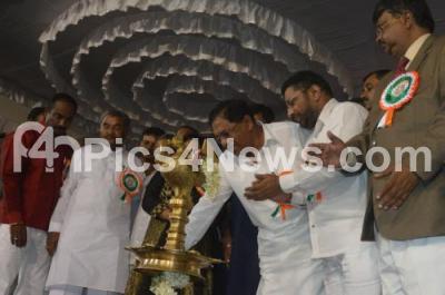 Photo Caption : G Parmeshwar, KPCC President, TB Jayachandra, Oscar Fernandez, MP and others lighting lamp to inaugurate the felicitation Ceremony at KPCC, in Bangalore on Friday 31st May 2013