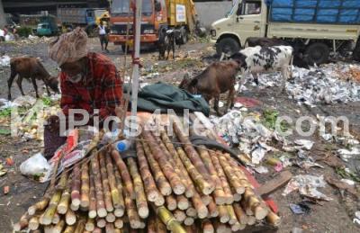 Photo Caption : A man seen selling sugarcanes amidst garbage around KR Market on World Environment Day 2013 Celebrations, in Bangalore on Wednesday 5th June 2013