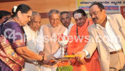 Photo Caption : MLC MV Rajashekharan with Chandrashekhar Kambar, Jnanpith Awardee, Kodala Math Shantaveera Swamiji, Leeladevi R Prasad, Former Minister seen inaugurating the Discussion Programme on Simple Marriage and Culture at Gandhi Bhavan, in Bangalore on Sunday 7th July 2013