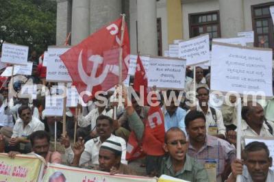 Photo Caption : Members of KSRTC and BMTC Employees Association seen protesting to fulfill their various demands at Town Hall, in Bangalore on Thursday 25th July 2013