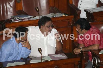 Photo Caption : Ministers Ambareesh with Santosh Lad and MLA Cheluvaraya Swamy seen discussing during the Budget Session at Vidhana Soudha, in Bangalore on Thursday 25th July 2013