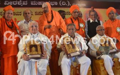 Photo Caption : Shamanooru Shivashankrappa, Minister for Horticulture, Tipanna, MLC, Bheemanna Khandre, Former Minister being felicitated by Shri Shivarathri Deshikendra Mahawswamiji, Dr Shri Shivamurthy Shivacharya Mahaswamy and others, during the Veerashaiva Lingayath Felicitation Ceremony at Palace Grounds, in Bangalore on Thursday 25th July 2013