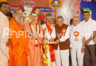 Photo Caption : Srimad Ujjayani Saddarma Simhasana Sri 1008 Jagadguru Siddalinga Rajadeshikendra Shivacharya Bhagavdpada with Sri Renuka Shivacharya Swamiji, MLC MV Rajashekaran, MLA Ravi Subramanya and others seen lighting lamp to inaugurate the Srimad Saddarma Jagruti Sammelana at Nijaguna Kshetra, Basavangudi, in Bangalore on 2nd of August 2013