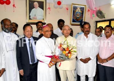 Photo Caption : Governor HR Bhardwaj presents bouquet to Bernard Moras, Archbishop on the eve of his 72nd Birthday, also seen KJ George, Home Minister, Lalrokhuma Pachau, DGP at Bishop House, in Bangalore on Saturday 10th August 2013