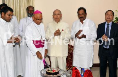 Photo Caption : Bernard Moras, Archbishop cutting cake celebrating his 72nd birthday with Governor HR Bhardwaj KJ George, Home Minister, Lalrokhuma Pachau, DGP at Bishop House, in Bangalore on Saturday 10th August 2013