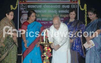 Photo Caption : Vasundara Bhupati with Prof G Venkatasubbaiah, Kusuma Narasimhan, Umaro and others seen lighting lamp to inaugurate Discussion Programme, organized by Kannada Lekhakiyara Sangh at Kannada Sahitya Parishath, in Bangalore on Saturday 14th September 2013