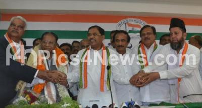 Photo Caption : Mumtaz Ali Khan, Former Minister with S Mohammed Ghouse Basha Ashrafi, Ex Chairman, Haj Committee, Manohar Ainapur and MK Baldev Krishna,. Retired IAS seen joining Congress Party in presence of G Parmeshwar, KPCC President and other Senior Congress Leaders at KPCC, in Bangalore on Thursday 26th September 2013