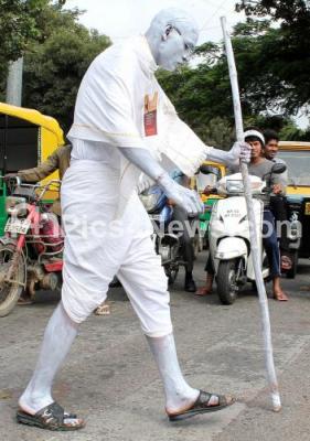 Follower of Mahatma Gandhi disguises himself and walk pasts the streets, celebrating Gandhi Jayanti at MG Road, in Bangalore on Wednesday 2nd October 2013