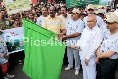 Photo Caption : Ramanath Rai, Forest Minister with Ramalinga Reddy, Transport Minister flagging off the walkathon for Conservation of Wildlife, to mark 59th Wildlife Week, organized by Karnataka Forest Department from High Court to Lalbagh, in Bangalore on Wednesday 2nd October 2013