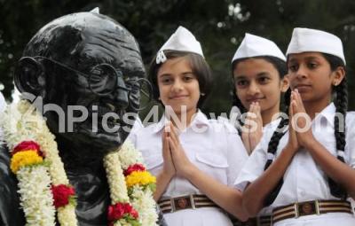 Photo Caption : Children pay tribute to Mahatma Gandhi, celebrating his birth anniversary at Mahatma Gandhi Statue, MG Road, in Bangalore on Wednesday 2nd October 2013