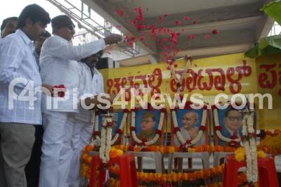 Photo Caption : Members of Kannada Chalavali Vatal Paksha seen offering floral tribute to Eminent personalities, celebrating Gandhi jayanti at Kempegowda Bus Station, in Bangalore on Wednesday 2nd October 2013