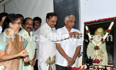 Photo Caption : Ananth Kumar, MP with Tejaswini Ananth Kumar, BN Vijaya Kumar, MLA, BS Satyanarayan, Mayor and others seen offering floral tribute to Mahatma Gandhi, during the Lecture on Gandhi and Rama Rajya, celebrating Gandhi jayanti, organized by Adamya Chetana at Vijaya Teachers College, in Bangalore on Wednesday 2nd October 2013
