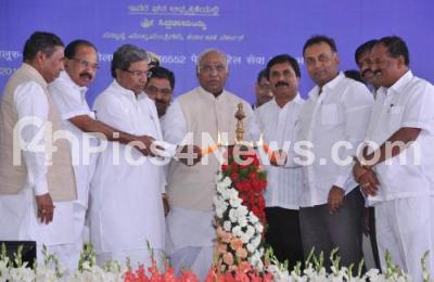 Photo Caption : K Siddaramaiah, Chief Minister with Mallikarjun Kharge, Union Minister for Railways, Veerappa Moily, Union Minister for Petroleum, KH Muniyappa, Union Minister for State MSME, Dinesh Gundu Rao, Food and Civil Supplies Minister and others seen lighting lamp to inaugurate the Bangalore to Chikkaballapur Kolar Passenger Train and Newly Converted Broad Guage Line of Kolar Chikkaballapur Section at Nandi Rangamandira, in Chikkaballapur on Friday 8th November 2013