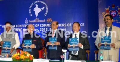 Photo Caption : Governor HR Bhardwaj with KJ George, Home Minister, Lalrokhuma Pachau, DGP, Raghvendra Auradkar, Police Commissioner and others releasing souvenir of the 2nd All India Police Commissioners Conference at Chancery Pavilion, in Bangalore on Friday 8th November 2013
