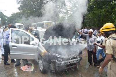 Photo Caption : A car had caught fire near Cauvery theatre at Sankey Road, firemen and a water tanker were pressed into action and with some people passing by helped to douse the fire in time, causing traffic jams at busy sankey road, in Bangalore on Sunday 24th of November 2013