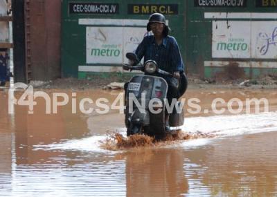 Photo Caption : Nightmare for two wheel drivers as they have to dodge waterlogged and muddy roads, where many roads are flooded with rain waters due to last night heavy rainfall, in Bangalore on Sunday 24th of November 2013