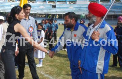 Photo Caption : Sahana Nagaraj, Olympian (Athletics) greets faculty, during the 27th All India Postal Athletics and Cycling meet at Kanteerva Stadium, in Bangalore on Wednesday 18th December 2013