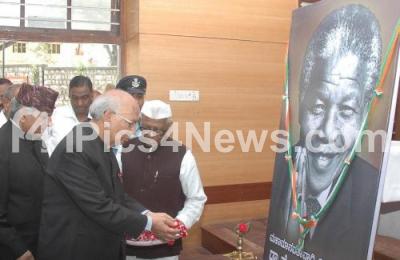 Photo Caption : Governor HR Bhardwaj paying floral tribute to South African Gandhi Nelson Mandela, at Gandhi bhavan, in Bangalore on Wednesday 18th December 2013