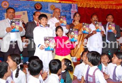 Photo Caption : HS Mahadev Prasad, Co Operation Minister with Bharti Vishnuvardhan, Senior Actress seen releasing Sahasa Simha Books, during the 4th Death Anniversary of Dr Vishnuvardhan, at Abhiman Studio, in Bangalore on Monday 30th December 2013