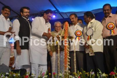 Photo Caption : KJ George, Home Minister with Jnanpith Awardee Prof Chandrashekhar Kambar, PC Mohan, MP, NA HAris, MLA and others seen lighting lamp to inaugurate the Silver Jubilee Celebrations of Kairalee Nikathan Education Trust at RBANMS Ground, in Bangalore on Saturday 4th January 2014