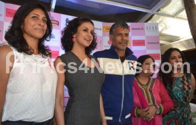 Photo Caption : Milind Soman and Gul Panag with Reeth Abraham and Maya Chakravarthy flagged off the 2nd Edition of Pinkathon, Indias only 10km Womens Run, at Hotel Olive Beach, in Bangalore on Tuesday 14th January 2014