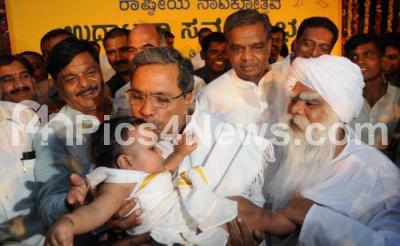 Photo Caption : Chief Minister K Siddaramaiah kissing a child, during the inauguration of Bahuroopi National Theatre Festival, also seen Sreenivas Prasad, Revenue Minister and HC Mahadevappa, PWD Minister, at Rangayana, in Mysore on Tuesday 14th January 2014