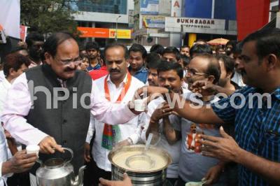 Photo Caption : BJP Leaders Venkaiah Naidu and PC Mohan distributing Modi Chaay to public, in support of BJP Prime Ministerial Candidate Narendra Modi, at Gandhi Nagar, in Bangalore on Saturday 1st February 2014