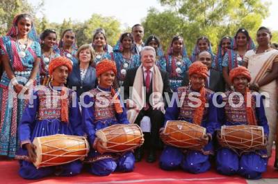 Photo Caption : Joachim Gauck, German President with wife Daniela Schadt seen with cultural artists, during their visit to Kendriya Vidyalaya, in Bangalore on Saturday 8th February 2014