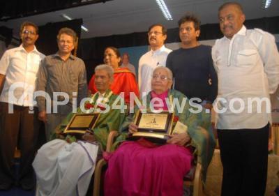 Photo Caption : Phakeerappa Varavi and Shantamma being felicitated by SP Varadaraju Awards by Baraguru Ramachandrappa, Parvathamma Rajkumar, Shivaraj Kumar and others, at Nayana Auditorium, in Bangalore on Saturday 8th February 2014