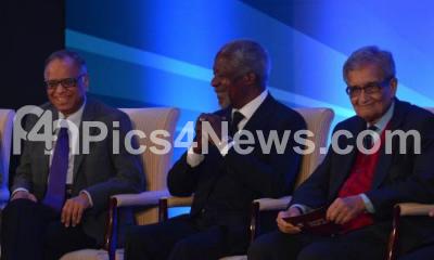 Photo Caption : Dr Kofi Annan, Founder and Chairman, Kofi Annan Foundation and 7th Secretary General, The United Nations seen interacting with NR Narayan Murthy, Co Founder, Infosys and Nobel laureate Amartya Sen, Indian Economist, during the Infosys Prize 2013 Award Ceremony, celebrating 5th Anniversary of Infosys Science Foundation, at ITC Gardenia, in Bangalore on Saturday 8th February 2014
