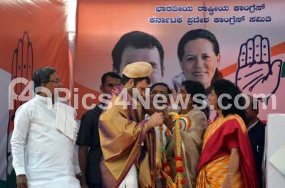 Photo Caption : Rahul Gandhi, AICC Vice President being felicitated by G Parmeshwar, KPCC President, Manjula Naidu, President, Karnataka State Women Congress Committee and others, during the All Women Convention, also seen K Siddaramaiah, Chief Minister at Mahatma Gandhi Stadium, in Tumkur on Sunday 16h February 2014
