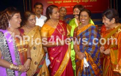 Photo Caption : Umashree, Kannada and Culture Minister seen interacting with Women Artists, during the State Level Women Cultural Festival, at Ravindra Kalakshetra, in Bangalore on Sunday 16h February 2014