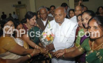 Photo Caption : JDs Women Leaders present bouquet to HD Devegowda, JDs National President, during the JDs Zilla Womens Conference, at JDs Office, in Bangalore on Wednesday 19th of February 2014