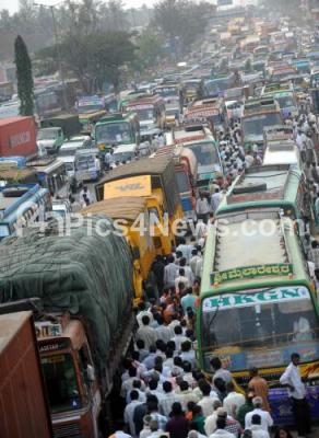 Photo Caption : Traffic Jam caused due to the Nandini Milk Producers awareness programme on controlling foot and mouth diseases, near Madavara Nice Junction, in Bangalore on Saturday 22nd February 2014