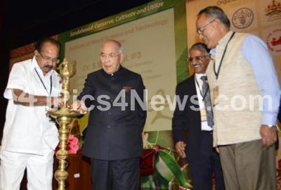 Photo Caption : Governor HR Bhardwaj with Veerappa Moily, Union Minister for Petroleum lighting lamp to inaugurate International Seminar on Sandalwood Current Trends and Future Prospects, at Indian Institute of Science, in Bangalore on Wednesday 26th February 2014
