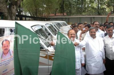 Event Description : K Siddaramaiah, Chief Minister with TB Jayachandra, Law Minister flagging off the Mobile Veterinary Vehicles for dispensing medicines and treatment of animals and live stocks with diseases, at Home Office Krishna, in Bangalore on Tuesday 4th March 2014