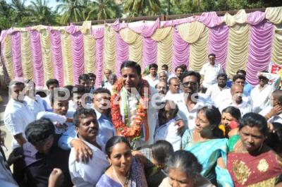 Photo Caption : C Narayanaswamy celebrating his victory, as he is elected Candiadate for Congress Bangalore North Parliamentary Constituency, after the Sankalp Samaroh, Indian National Congress Primaries 2014, Second Primary (Internal Elections), at Patels Inn, RT Nagar, in Bangalore on Thursday 13th March 2014