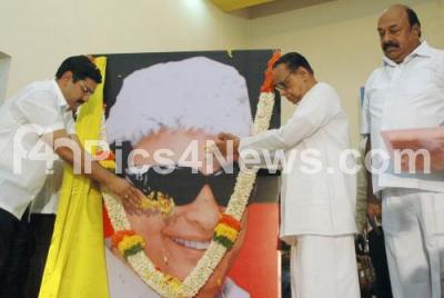 Photo Caption : BS Vijayendera offering floral tribute to Bharat Rathna MGR, during the inauguration of Bharat Rathna MGR Seva Kendra, in the presence of Dr HV Hande, Former Minster and Muniyappa, Ex MLA at Central Hall, Sheshadripuram, in Bangalore on Sunday 16th March 2014