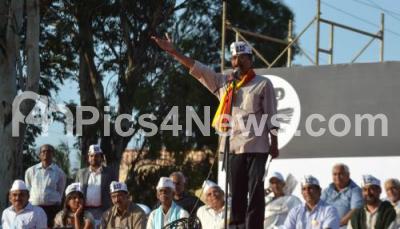 Photo Caption : Arvind Kejriwal, Founder, Aam Aadmi Party addressing with his Karnataka MP Candidates, during the AAP Public Meeting at Freedom Park, in Bangalore on Sunday 16th March 2014