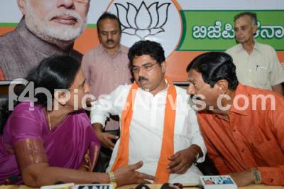 Photo Caption : Jyothi Reddy interacting with R Ashok and Bache Gowda, during the BJP Joining Ceremony, at Jagannath Bhavan, BJP Office, in Bangalore on Sunday 30th March 2014