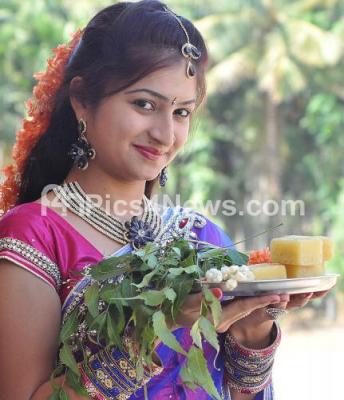 Photo Caption : Woman holding Bevu Bella (Neem and Jaggery) in traditional attire, on the eve of Ugadi festival, in Bangalore on Sunday 30th March 2014