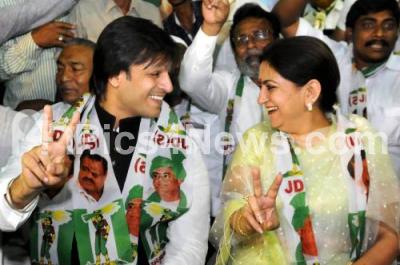 Photo Caption : Actor Vivek Oberoi with Nandini Alva, JDs Bangalore Central JDs Candidate showing the Victory sign, during JDs Workers Meeting, at Chamarajpet, in Bangalore on Sunday 30th March 2014