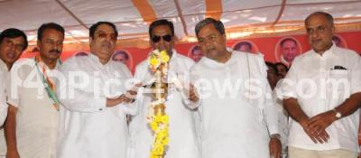 Photo Caption : K Siddaramaiah, Chief Minister with R Dhruvanarayana, Chamarajnagar Congress Candidate, HS Mahadev Prasad, Co Operation Minister, CM Ibrahim and other seen lighting lamp to inaugurate the Public Meeting at Varuna Constituency in Mysore on Sunday 30th March 2014