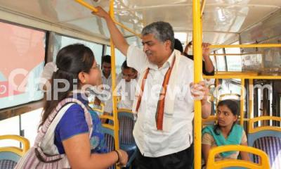 Event Description : Nandan Nilekani, Bangalore South Congress Candidate interacting with Commuters, traveling in the Bus, celebrating Bus Day, campaigning for loksabha Elections from Jayanagar Bus Stop to JP Nagar, in Bangalore on Friday 4th April 2014