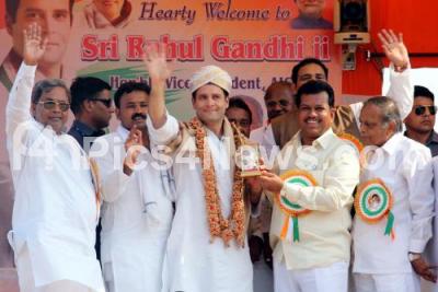 Photo Caption : Rahul Gandhi, Vice President, All India National Congress being felicitated by K Siddaramaiah, Chief Minister, PT Parmeshwar Naik, Labour Minister and others, during the Public Meeting, in Bellary on Friday 4th April 2014